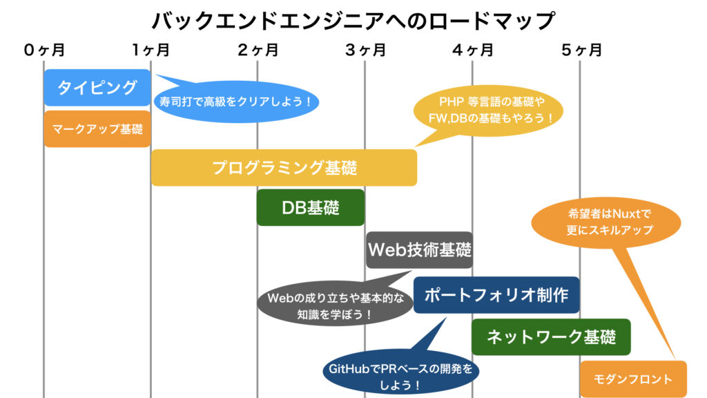 なので受講生の学習期間や目標に合わせてオリジナルのロードマップを作成してエンジニア転職の確度が上がる様に学習をサポートします。